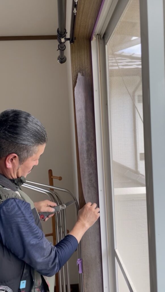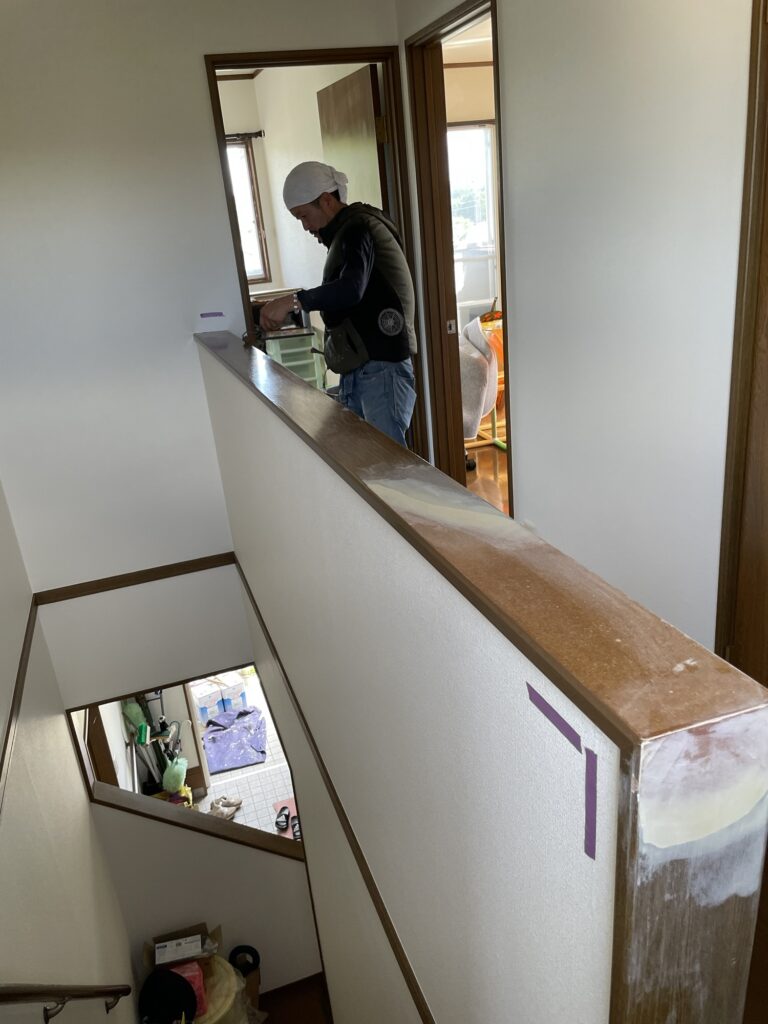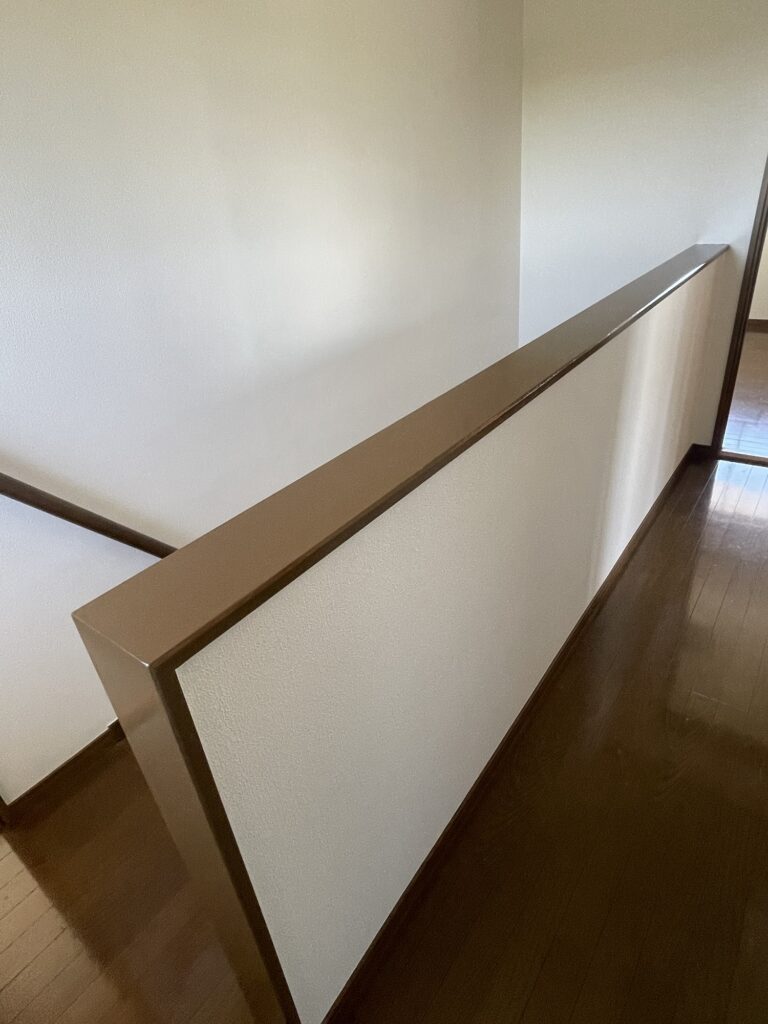 窓枠やサッシ周り、階段の手すりなど、既存のプリント合板が日焼けによる剥がれや、経年劣化による色褪せなどが多くみられました。